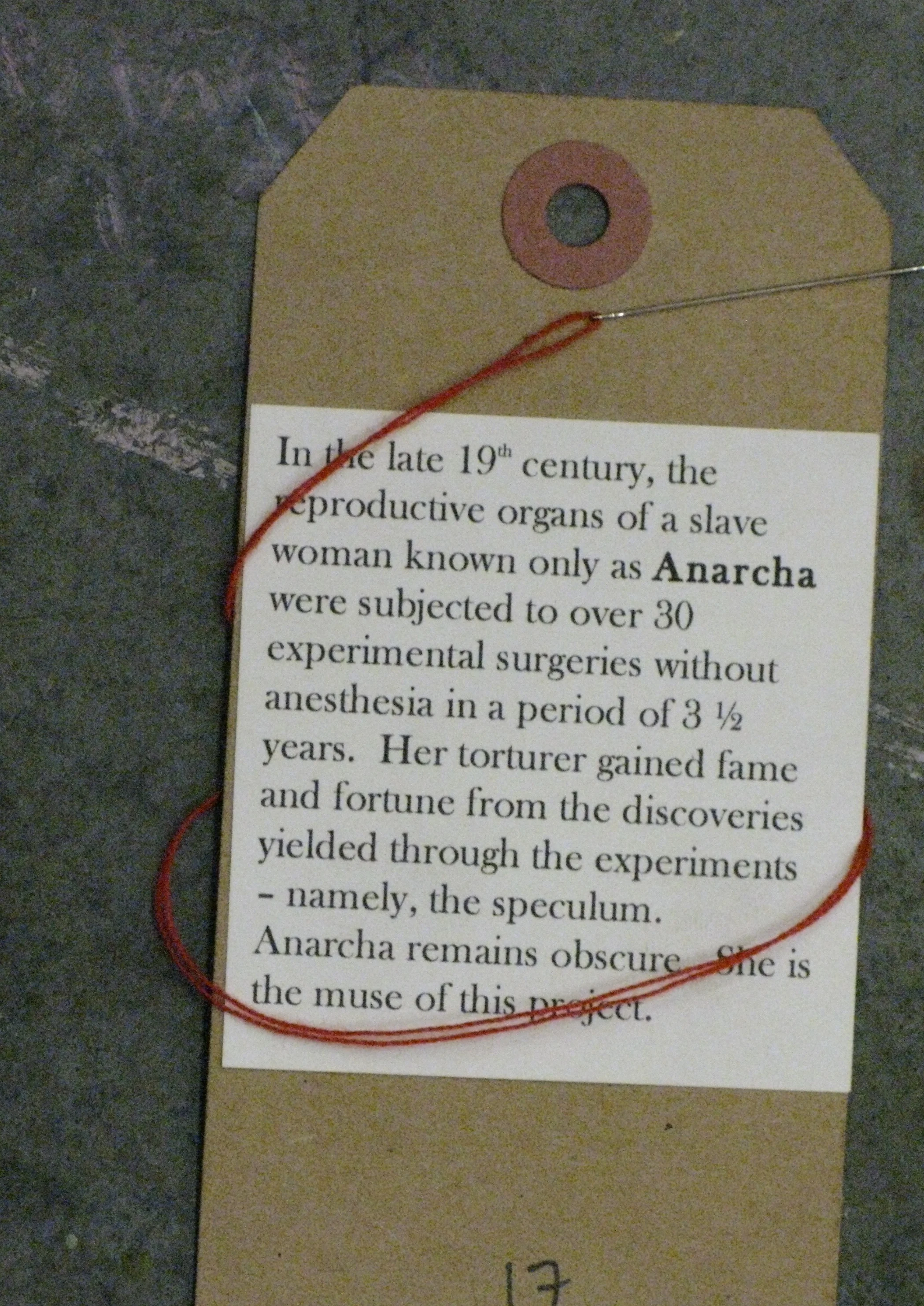 For weeks before the performance, I told Anarcha’s story to the 30 women participants. We spoke about their experiences in the doctor’s office as well as our assumptions of how Anarcha felt during her surgeries. On the day of the performance, I lay on a table built by one of the women on stage. Each of the 30 women was given a numbered placard with a needle and thread and asked to come unto the stage, make a cut into my underwear and sew it back up.